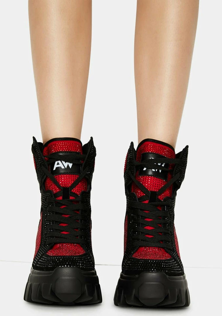 features a two-tone upper with rhinestone studs, front lace up closures, and treaded platform soles.