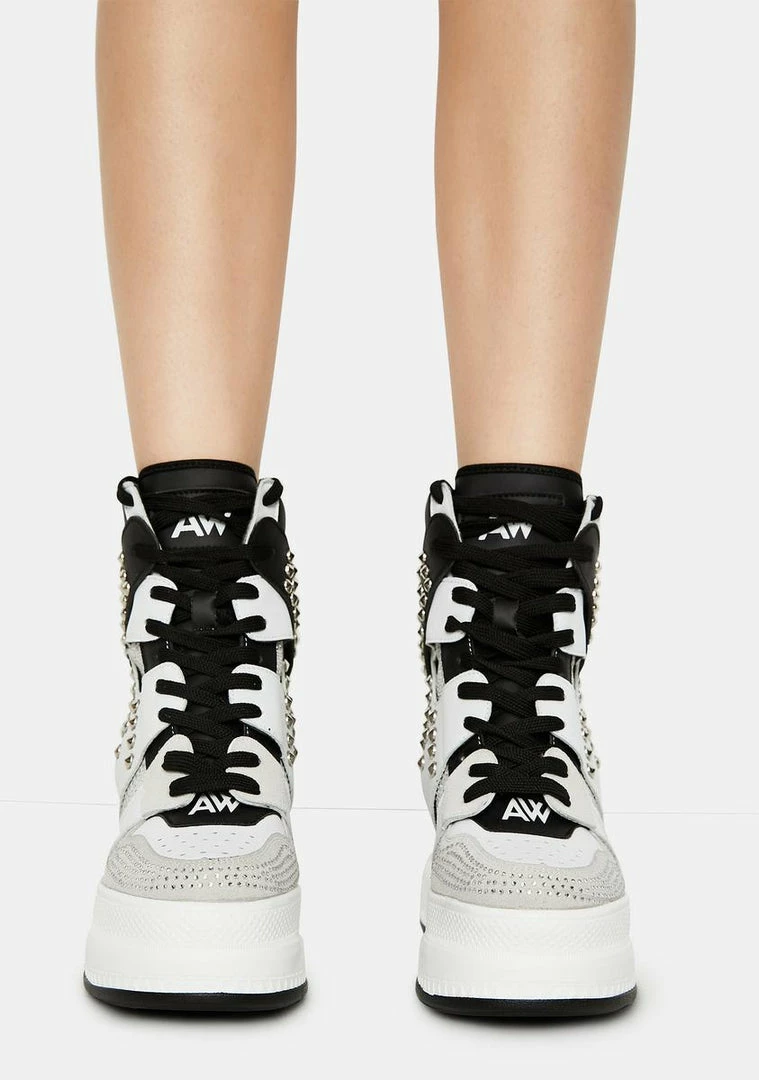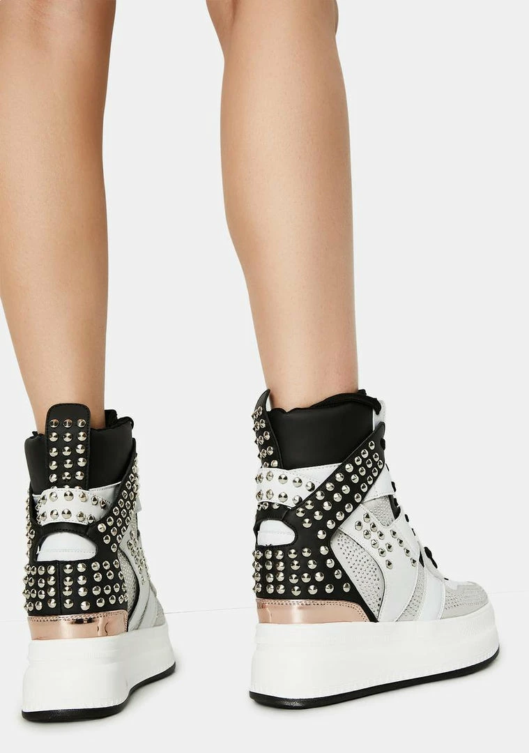 cuz you’ve got standards as high as your heels! These streetwear high top sneakers have hidden wedge heels, stud detailing, textured vegan leather panels, and lace up fronts.