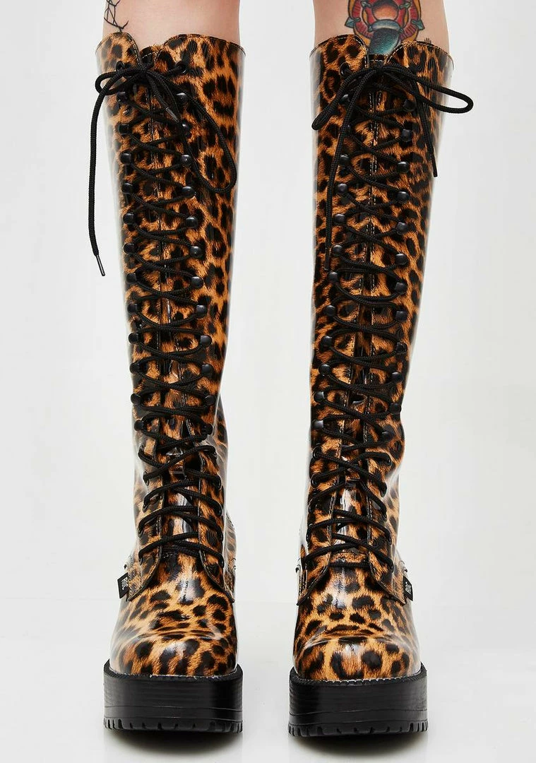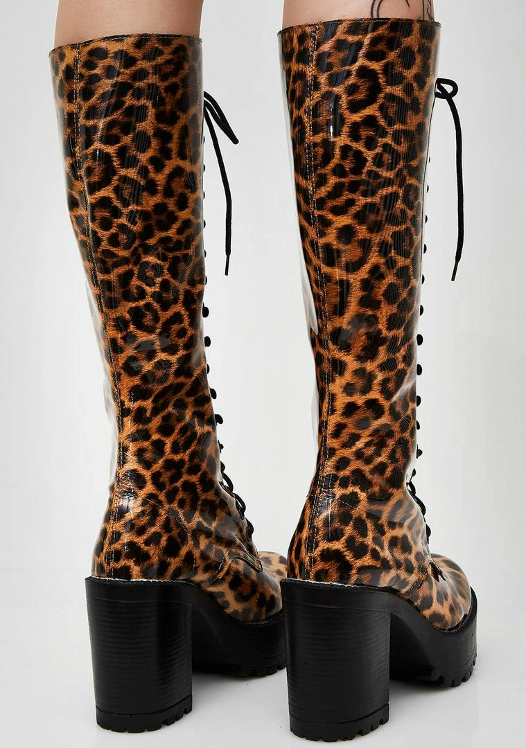 cuz you a wild thang, bb. Back on the prowl with these leather knee-high boots that have a leopard print all ova, chunky block heelz and lace-up closures.