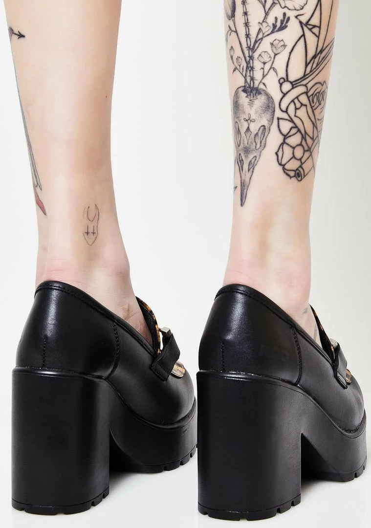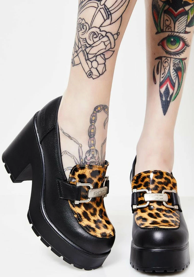 cuz ur feelinΓ’ΒΒ extra fierce. These black mules have thikk platform soles and leopard panels on the front with silver hardware details.